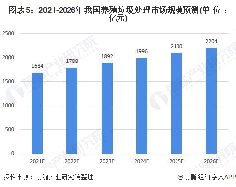 因此按照2026年全國(guó)畜禽糞污綜合利用率達(dá)到95%,2023年達(dá)到85%計(jì)算,前瞻預(yù)計(jì)2023年全國(guó)畜禽糞污治理市場(chǎng)規(guī)模將超過(guò)1800億元,2026年則有望達(dá)到2200億元,行業(yè)市場(chǎng)空間巨大。