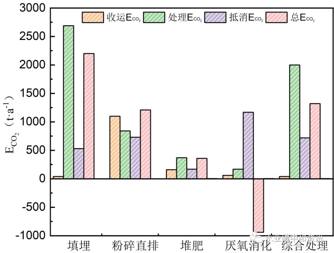 評(píng)估的LCA包括餐廚垃圾收集與運(yùn)輸、處理、產(chǎn)物各個(gè)處置環(huán)節(jié);LCA之碳排放涉及的溫室氣體包括CO2、N2O和CH4;N2O和CH4造成的溫室效應(yīng)分別乘以298、25折算為CO2當(dāng)量——ECO2。經(jīng)微生物分解代謝作用產(chǎn)生的CO2為生物成因(生源性),是有機(jī)物的自然歸宿,不列入碳排放計(jì)算;產(chǎn)生的CH4經(jīng)回收后用于發(fā)電或熱電聯(lián)產(chǎn)(CHP),這一途徑形成的碳排放不納入LCA碳排放匯總與計(jì)算。被回收的能源與資源可相應(yīng)地抵消碳排放量,主要包括由CH4用于發(fā)電或CHP后回收的電能或(和)熱能與可用作肥料的沼渣;產(chǎn)生的熱能除滿(mǎn)足自身升溫需求之外,未利用的剩余熱能不計(jì)入抵消ECO2項(xiàng)目?jī)?nèi)。每kW·h電能可抵消0.608 kg ECO2,每kg肥料(以N計(jì))可抵消4 kg ECO2。據(jù)此計(jì)算各餐廚垃圾處置方式對(duì)應(yīng)的年ECO2數(shù)據(jù)(圖3)。